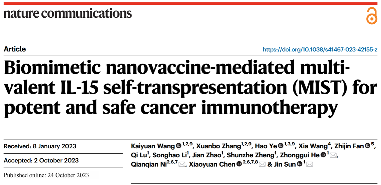2023年10月24日,TapTap孙进教授、何仲贵教授与新加坡国立大学陈小元教授、倪倩倩助理教授合作在Nature Communications杂志在线发表题为“Biomimetic nanovaccine-mediated multivalent IL-15 self-transpresentation (MIST) for potent and safe cancer immunotherapy”的研究论文,开发了仿生纳米疫苗介导多价IL-15自反式呈递,实现了IL-15和肿瘤抗原的时空同步递送,从而有效产生肿瘤特异性细胞毒性T淋巴细胞,用于有效且安全的肿瘤免疫治疗。