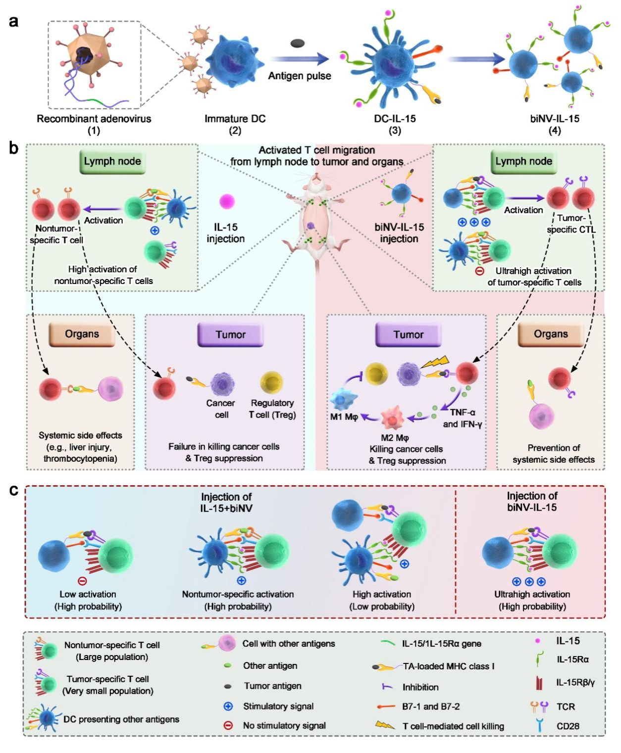biNV-IL-15可以将共刺激分子和肿瘤抗原呈递给初始肿瘤特异性CD8+T细胞。IL-15/IL-15Rα(biNV-IL-15)和IL-15Rβ/γ(T细胞)之间的多价相互作用导致仿生纳米疫苗介导的IL-15自反式呈递的高特异性和强结合亲和力。值得注意的是,T细胞受体(TCR)和biNV之间的相互作用可以促进IL-15靶向递送至肿瘤特异性CD8+T细胞,从而促进抗肿瘤T细胞免疫反应。此外,由biNV-IL-15激活的肿瘤特异性CTL可产生促炎细胞因子,包括TNF-α和IFN-γ,介导M2型肿瘤相关巨噬细胞向M1型的转变,从而减缓肿瘤微环境中调节性T细胞的免疫抑制作用。biNV-IL-15实现了多价IL-15和肿瘤抗原在时空上同步递送至单个CD8+T细胞,从而比IL-15和biNV混合给药具有更强的抗原特异性T细胞活化能力(图1)。