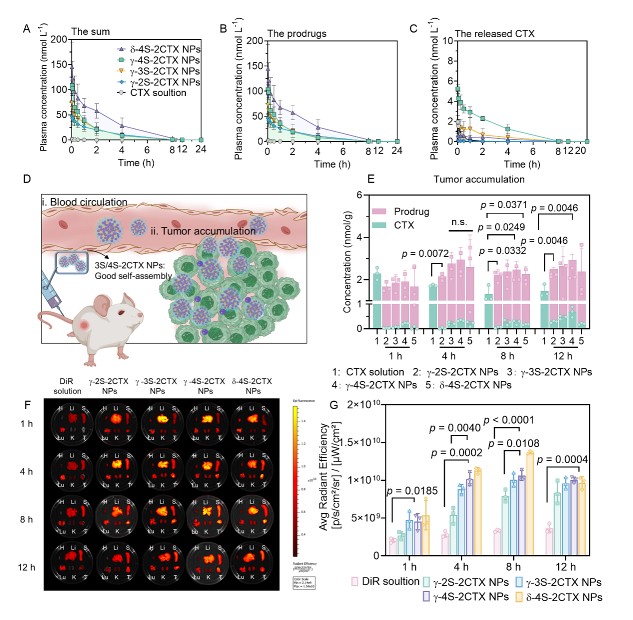 图4. 四硫键桥连前药自组装纳米粒的体内药动学和组织分布