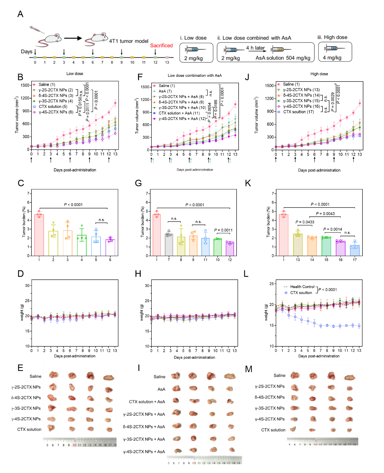 在这项研究中(图1),作者设计了一系列四硫键桥连卡巴他赛(CTX)二聚体前药,系统地考察了四硫键的化学位置对于DPNAs的影响。在综合化学稳定性和激活选择性等因素后,选择了最具潜力的γ-4S-2CTX,并设计了相应二硫键/三硫键桥连前药作为对照。与三硫键和二硫键相比,四硫键赋予DPNAs更强的自组装能力,保证了DPNAs在体内的稳定性。值得注意的是,四硫键具有超高还原反应性,使DPNAs成为高选择性的“肿瘤炸弹”,可以被肿瘤部位的高水平GSH选择性“引爆”,释放毒性CTX杀伤肿瘤细胞。此外,该团队还提出了一种“火上浇油”的策略,通过补充外源还原剂来进一步加强肿瘤部位的还原应激,加速γ-4S-2CTX NPs的活化,从而获得更好的抗肿瘤效果,并同时提高了其肿瘤选择性。