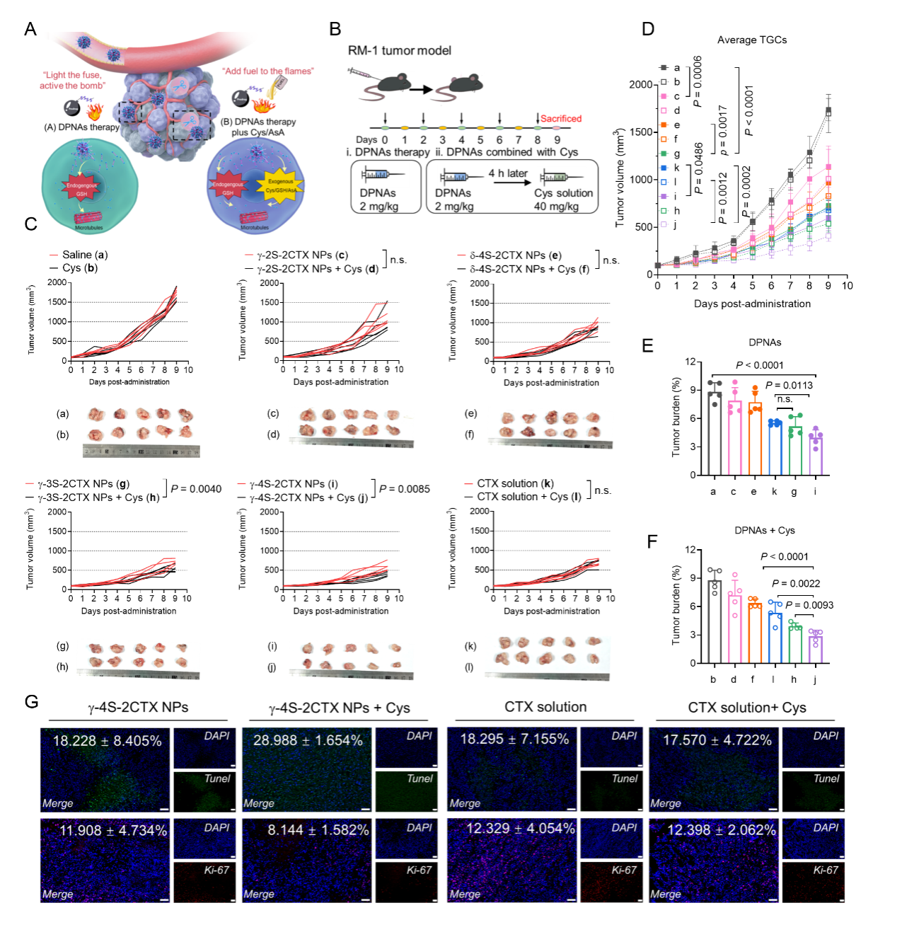 γ-4S-2CTX较长的γ-四硫键连接保证了其体内稳定性和安全性。同时,超高还原反应性的四硫键使γ-4S-2CTX NPs可以被肿瘤中的内源性GSH选择性地“引爆”,杀伤肿瘤细胞。为了充分发挥DPNAs的潜力,向肿瘤部位补充外源性还原剂,如同"火上浇油",进一步引发γ-4S-2CTX NPs的活化,从而获得更好的抗肿瘤效果。