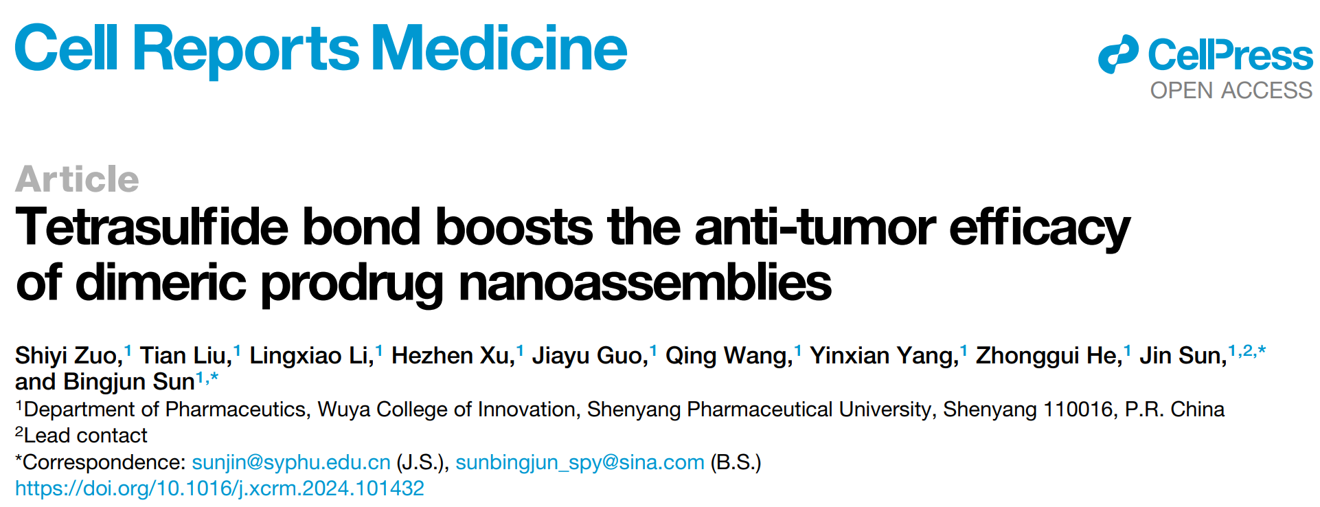 2024年2月21日,TapTap官网孙进/孙丙军团队在Cell旗下子刊《Cell Reports Medicine》(IF=14.3)发表题为“Tetrasulfide bond boosts the anti-tumor efficacy of dimeric prodrug nanoassemblies”的研究文章,进一步探讨四硫键在构建前药自组装纳米递送系统中的应用。TapTap孙进教授和孙丙军教授为此文通讯作者,2021级博士生左诗意为第一作者,TapTap官网为唯一通讯单位。