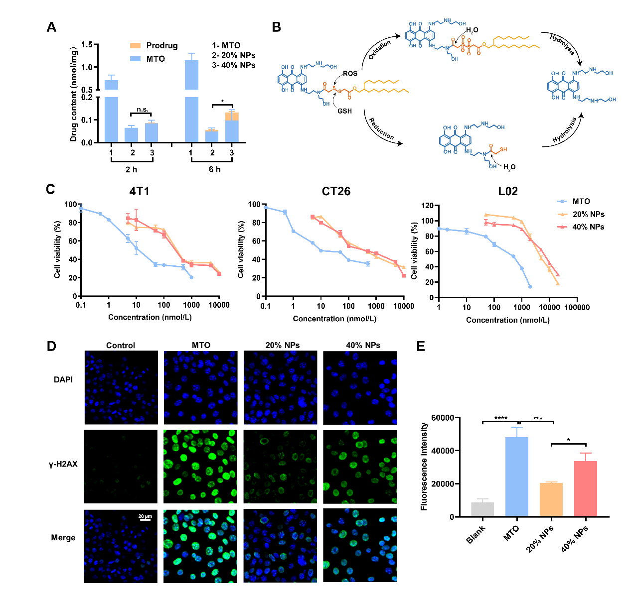 作者接着进行了体外细胞实验。在选择的两种自组装纳米粒(20% NPs 和 40% NPs)中,40% NPs因具有更高的组装稳定性,被细胞摄取的量更多,并能有效释放出母药。因此,其具有更高的细胞毒性,能够造成DNA损伤,最终诱导细胞凋亡(图3)。