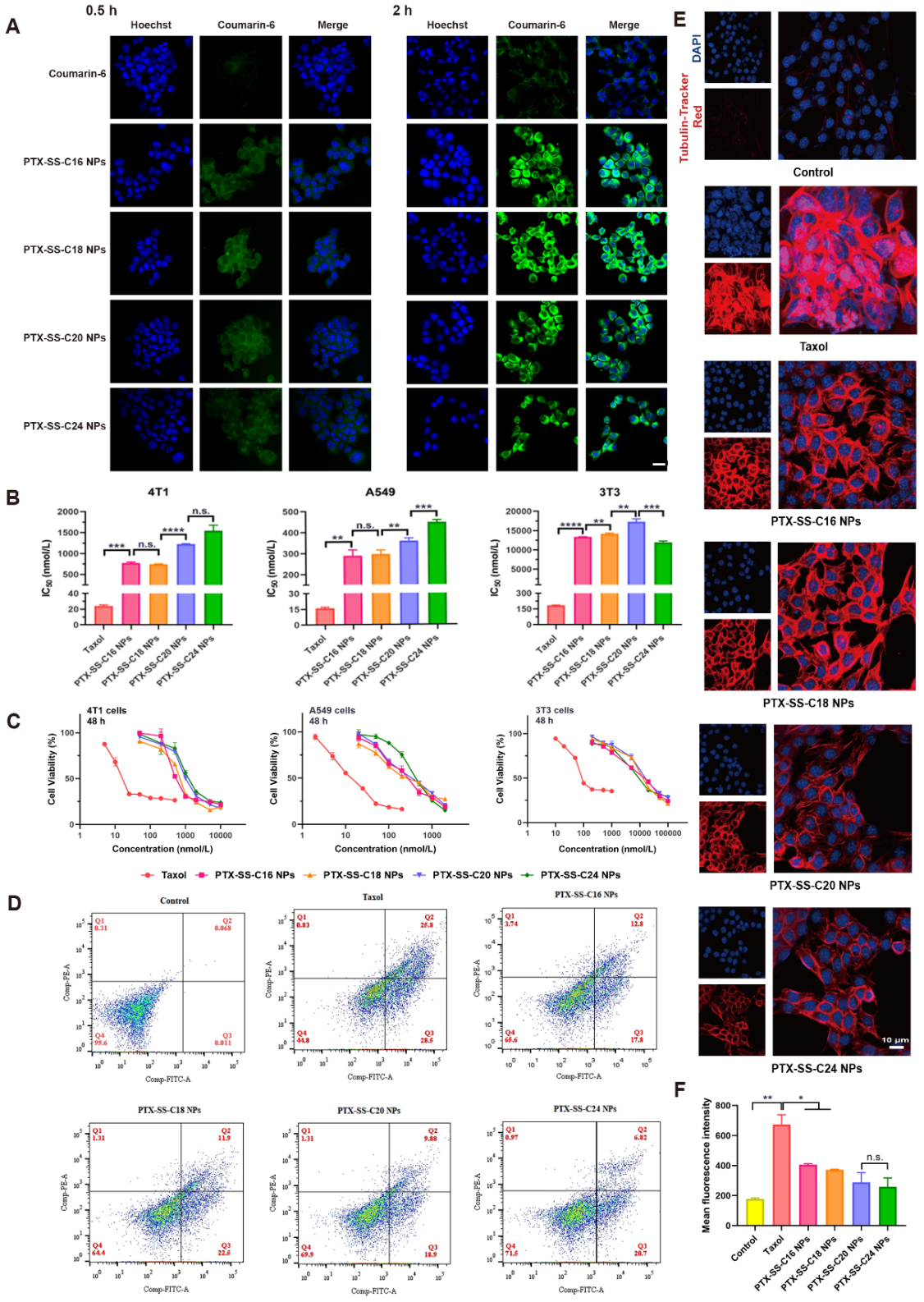 在细胞水平上,进一步考察了修饰模块结构对前药纳米组装体的影响。发现修饰模块的碳链长度越短,前药纳米组装体能够释放的紫杉醇越多,细胞毒性越强(图4)。此外,修饰模块的碳链长度还会影响前药纳米组装体的肿瘤选择性,进而影响前药纳米组装体的体内抗肿瘤作用和安全性。其中,PTX-SS-C18 NPs的肿瘤选择性最好,而PTX-SS-C24 NPs的肿瘤选择性最差。可能是由于PTX-SS-C18 NPs具有适当的碳链长度和氧化还原敏感性,最终影响了前药纳米组装体对肿瘤细胞和正常细胞的细胞毒性作用。