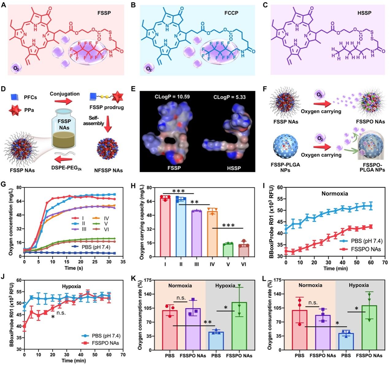 首先,作者以1H,1H-全氟己胺作为氟化侧链,二硫键作为还原敏感的化学连接臂,设计合成了氟化焦脱镁叶绿素a(PPa)功能性前药(FSSP),并分别合成了以酯键直接相连的非还原敏感氟化PPa前药(FCCP)和二硫键桥连的还原敏感非氟化PPa前药(HSSP)作为对照。利用一步纳米沉淀法成功制备了FSSP纳米粒、FCCP纳米粒和HSSP纳米粒。与HSSP纳米粒相比,FSSP纳米粒和FCCP纳米粒表现出相对较小的粒径,表明氟化侧链能促进前药形成更加紧凑的纳米结构。此外,制备了氧气饱和的无载体前药自组装纳米粒(FSSPO纳米粒、 FCCPO纳米粒和 HSSPO纳米粒)和载相同前药的PLGA纳米粒,并利用便携式荧光溶解氧分析仪探究并对比了无载体纳米粒与常规PLGA纳米粒的载氧效率。结果表明无载体前药自组装纳米粒(FSSPO纳米粒、FCCPO纳米粒和 HSSPO纳米粒)具有明显的载氧优势。利用细胞耗氧率试剂盒考察了载氧纳米粒在常氧和乏氧条件下对4T1小鼠乳腺癌细胞与CT26小鼠结肠癌细胞的耗氧率的影响。结果表明,氟化前药纳米粒能够有效的补充氧气,但肿瘤细胞在乏氧条件下急剧增加的耗氧率会极大的抵消氧气供应对乏氧的缓解效果。