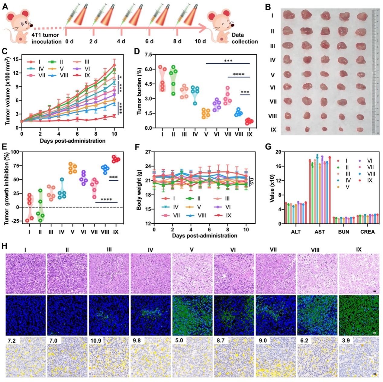 图6. 氧气纳米调节器在4T1荷瘤小鼠中的抗肿瘤作用。