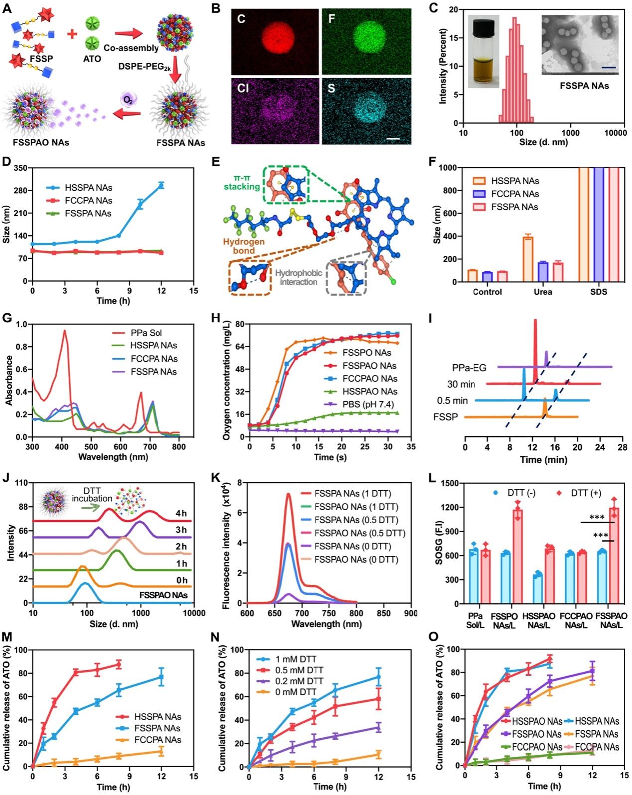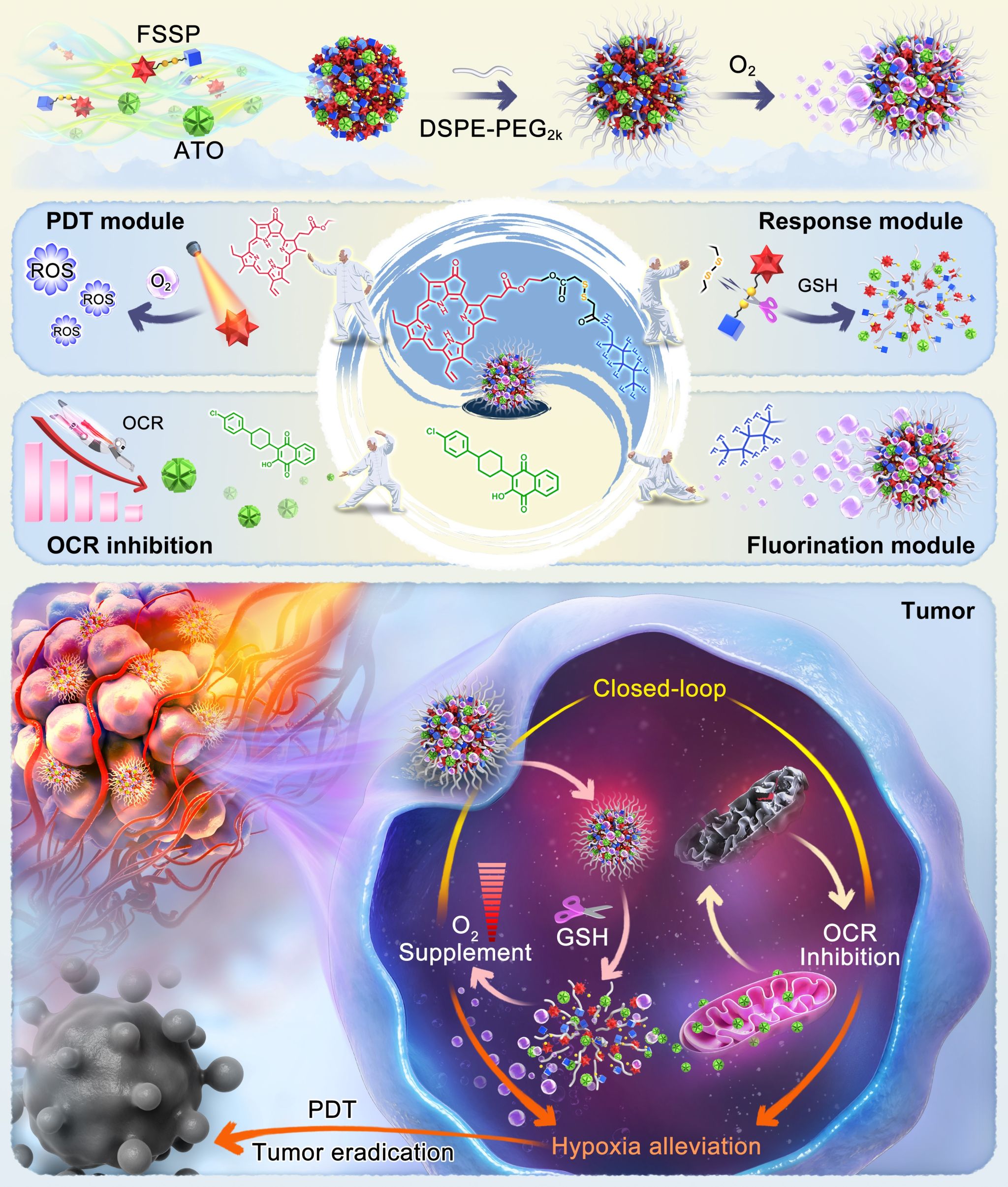 在这项研究中,作者构建了一种具有载氧能力的PPa的氟化前药(FSSP)和耗氧抑制剂阿托伐醌(ATO)共组装的杂化纳米组装体(FSSPAO纳米粒)。在向肿瘤供应氧气的同时,抑制肿瘤细胞对氧气的消耗,从而实现闭环缓解肿瘤乏氧增效PDT。FSSP中的氟化侧链不仅可以赋予纳米粒优异的载氧能力,而且还可以促进FSSP和ATO共组装。此外,前药结构中含二硫键的FSSPAO纳米粒具有非常好的还原敏感特性,在还原条件下,FSSP前药特异性激活引发FSSPAO纳米粒解体,显著缓解了PPa的ACQ效应,提升了其单线态氧产生能力,且纳米粒解体促进ATO快速释放。FSSPAO纳米粒有效调控肿瘤乏氧并增效PDT,在多种荷瘤小鼠模型中均显著抑制肿瘤生长。