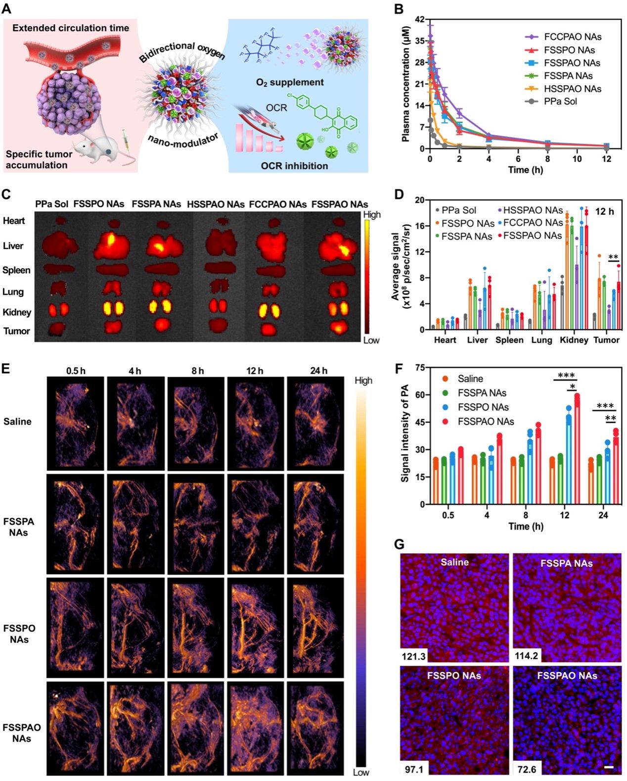 以SD大鼠为动物模型,作者考察了PPa溶液剂、FSSPO纳米粒、FSSPA纳米粒、HSSPAO纳米粒、FCCPAO纳米粒和FSSPAO纳米粒的体内药动学行为。结果表明,与PPa溶液剂与稳定性较差的非氟化HSSPAO纳米粒相比,具有氟化侧链的FSSPAO纳米粒显著延长PPa在血液中的循环时间,载氧和ATO的引入没有对纳米粒的药动学产生显著影响。随后,以4T1乳腺癌荷瘤BALB/c小鼠为动物模型,考察了PPa溶液剂、FSSPO纳米粒、FSSPA纳米粒、HSSPAO纳米粒、FCCPAO纳米粒和FSSPAO纳米粒的体内组织分布。结果表明,相较于PPa溶液剂和HSSPAO纳米粒,氟化前药纳米粒(FSSPA纳米粒、FCCPAO纳米粒和FSSPAO纳米粒)显著增加PPa在肿瘤部位的蓄积,且ATO和氧气的引入均对纳米粒在体内分布没有产生显著的影响。此外,以4T1乳腺癌荷瘤BALB/c小鼠为模型,考察了生理盐水、FSSPA纳米粒、FSSPO纳米粒和FSSPAO纳米粒的体内缓解肿瘤乏氧能力。结果表明,仅具有供氧能力的前药自组装纳米粒(FSSPO纳米粒)和仅具有抑制耗氧能力的非载氧共组装纳米粒(FSSPA纳米粒)均不能有效提高小鼠瘤内的氧气水平,而兼具供氧和抑制耗氧能力的FSSPAO纳米粒在体内缓解肿瘤乏氧方面显示出明显的优势。