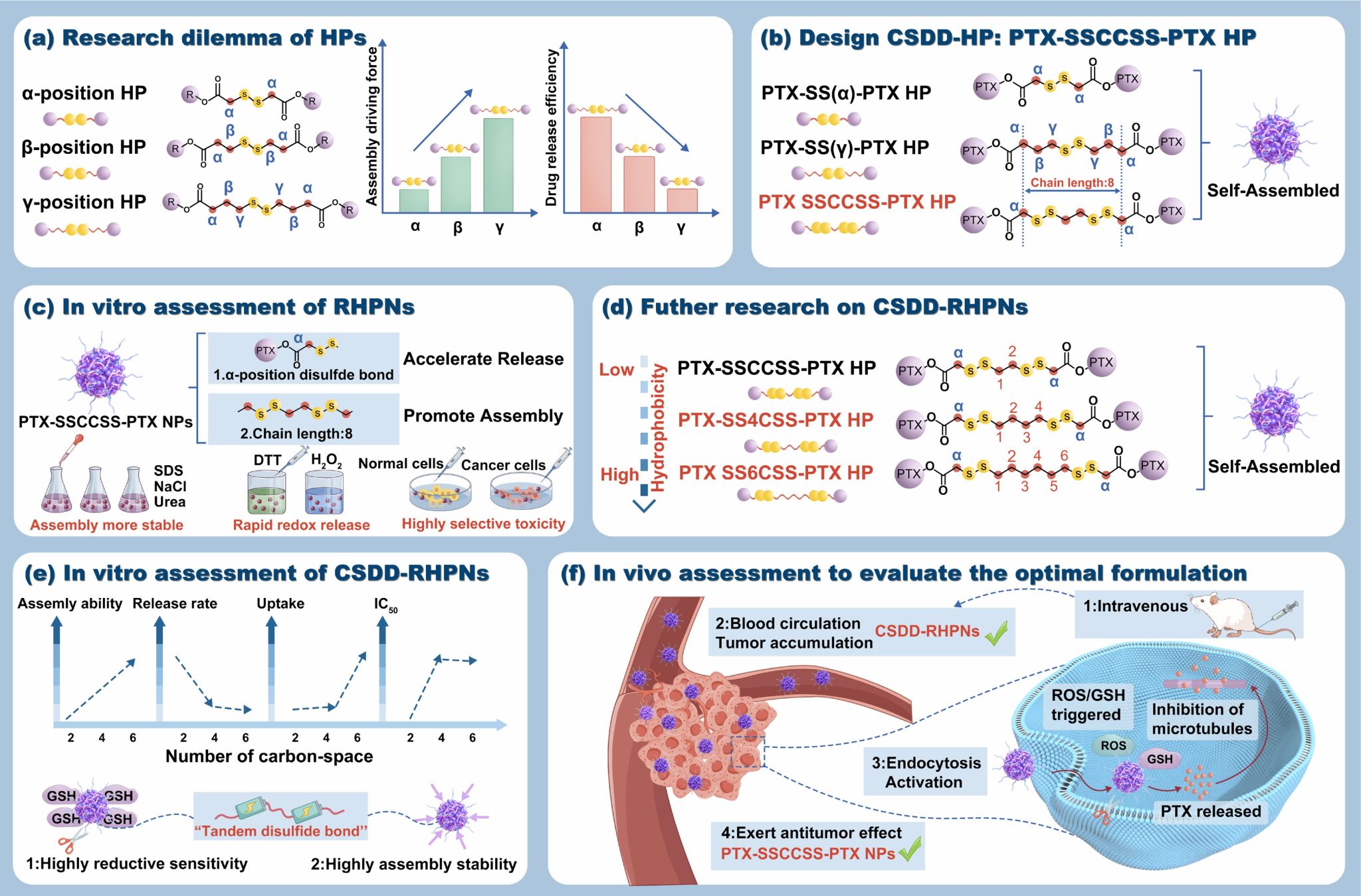为了解决稳定性与药物快速释放之间的矛盾,我们首先设计了具有两个碳原子间隔的碳原子间隔双二硫键(CSDD)化学桥连,并选择紫杉醇(PTX)作为代表性模型药物构建了CSDD桥连的RHPNs (CSDD-RHPNs)(方案1)。在CSDD中,两个二硫键位于酯键的α-位置,与γ-位置单二硫键桥接同源二聚体前药(SD-HP)保持相同的化学键长;旨在提高药物释放速度和组装稳定性。以α-和γ-位置单二硫键桥接RHPNs (SD-RHPNs)为对照,从组装稳定性、药物释放动力学和细胞毒性等方面评价了CSDD-RHPNs的性能。